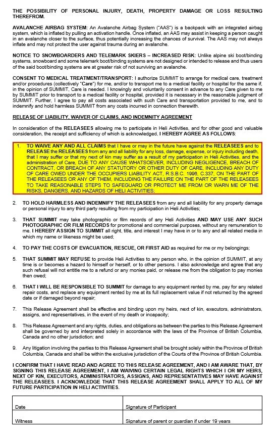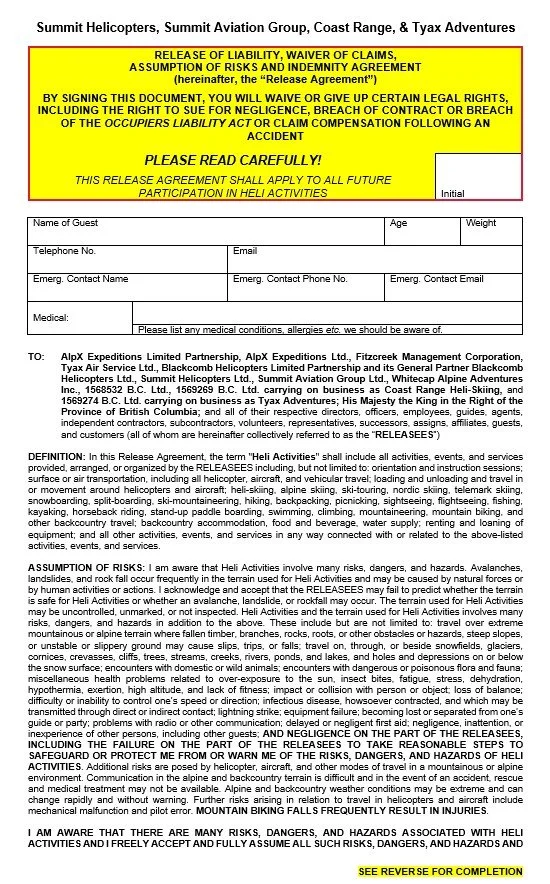 Each guest will be required to sign a Release of Liability, Waiver of Claims, Assumption of Risks, and Indemnity Agreement (“Waiver”) before the planned activity/trip commences. In no event will a guest be permitted to participate in a planned activity/trip without having signed a Waiver. Please note that, in addition to agreeing to the Waiver electronically, (whether by checking a box prior to check-out, or by completing a Waiver emailed to you), each guest will be required to sign a paper version of the Waiver at check-in.